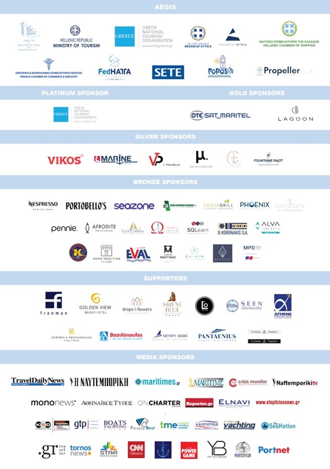 MEDIA SPONSORS: Travel Daily News, Ναυτεμπορική, Maritimes.gr, Maritime Economies, Crisis Monitor, Ναυτεμπορική TV, Mononews, Αθηναϊκός Τύπος, On Charter magazine, Reporter.gr, Elnavi, Efoplistesnews.gr, Money&Tourism, Greek Travel Pages, Boats&Yachting, PrevezaBest, Tourism Today, Κοινωνική, Cyprus Yachting Magazine, The SeaNation, Gr traveler, Tornos news, Star Κεντρικής Ελλάδας, CNN Greece, Mare Greco, Power Game, The Yacht Book, Portcity gr, PortNet.