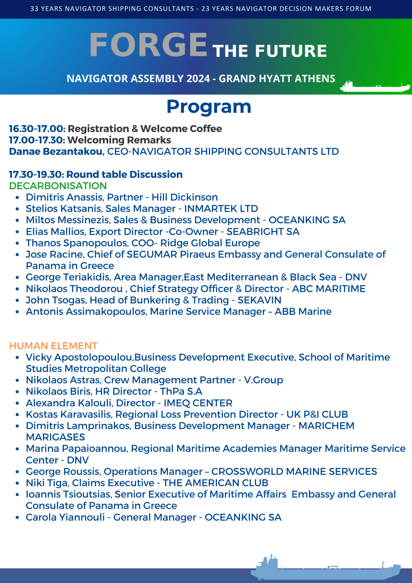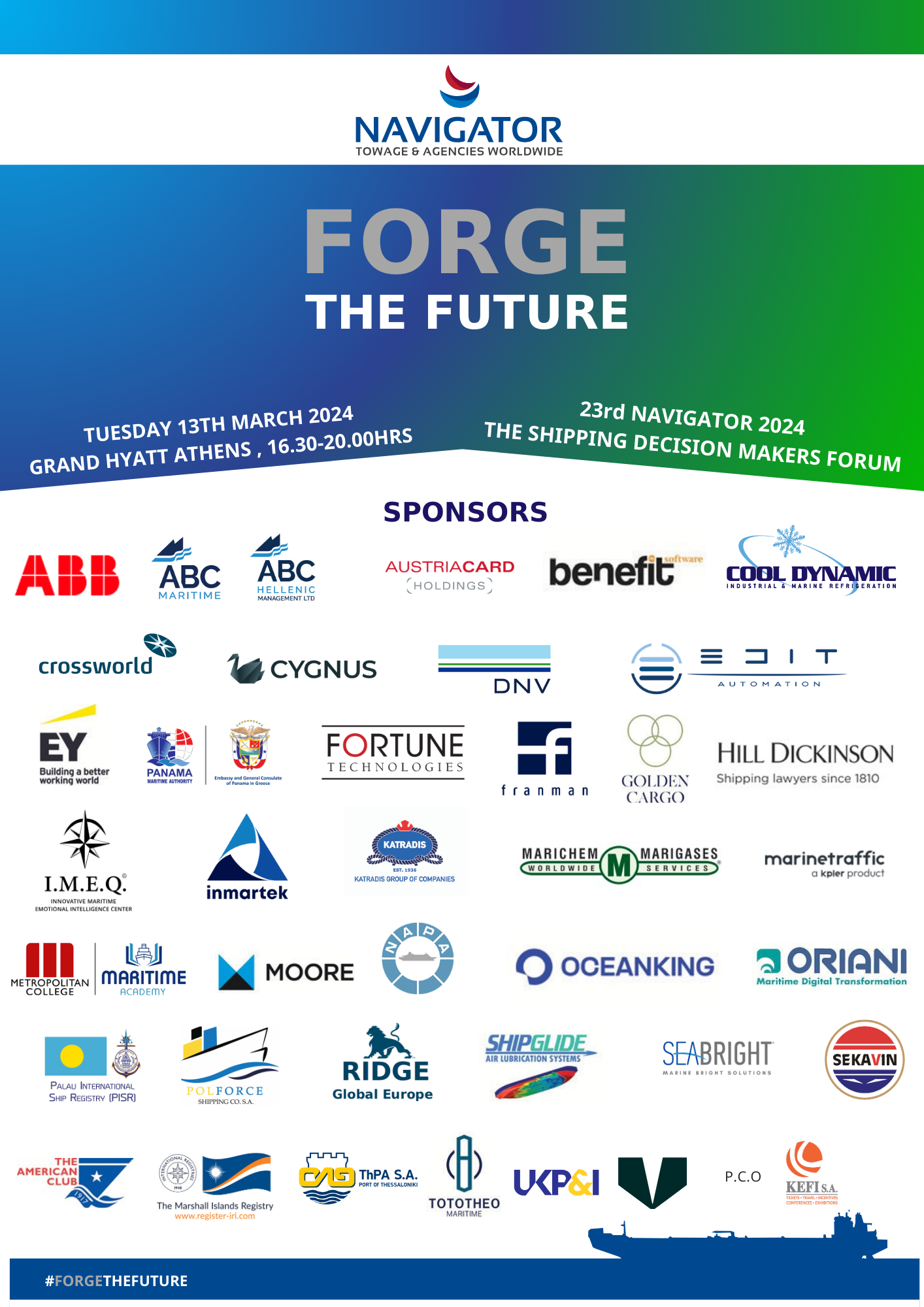 Η Navigator Shipping Consultants ανακοινώνει το NAVIGATOR ASSEMBLY 2024, με θέμα “FORGE THE FUTURE”. Η εκδήλωση έχει προγραμματιστεί να πραγματοποιηθεί την Τετάρτη 13 Μαρτίου 2024, στο Grand Hyatt Athens, με ώρα έναρξης 16:30.