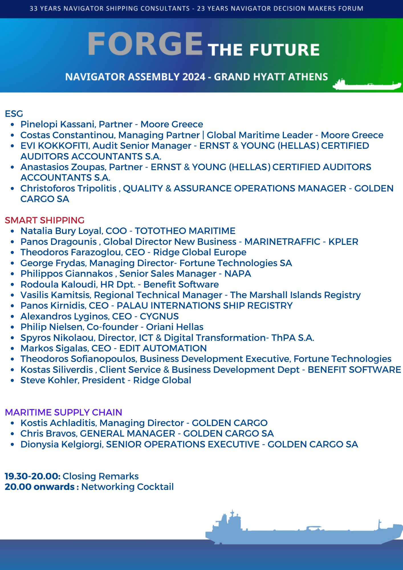 Η Navigator Shipping Consultants προσκαλεί θερμά την εταιρεία σας να συμμετάσχει και να συμβάλει στην επιτυχία του Navigator Assembly 2024. Οι εγγραφές είναι ανοικτές μέχρι την 1η Μαρτίου 2024. Για εγγραφές και πληροφορίες, παρακαλούμε επικοινωνήστε μαζί μας στο conference@navigatorltd.gr.
