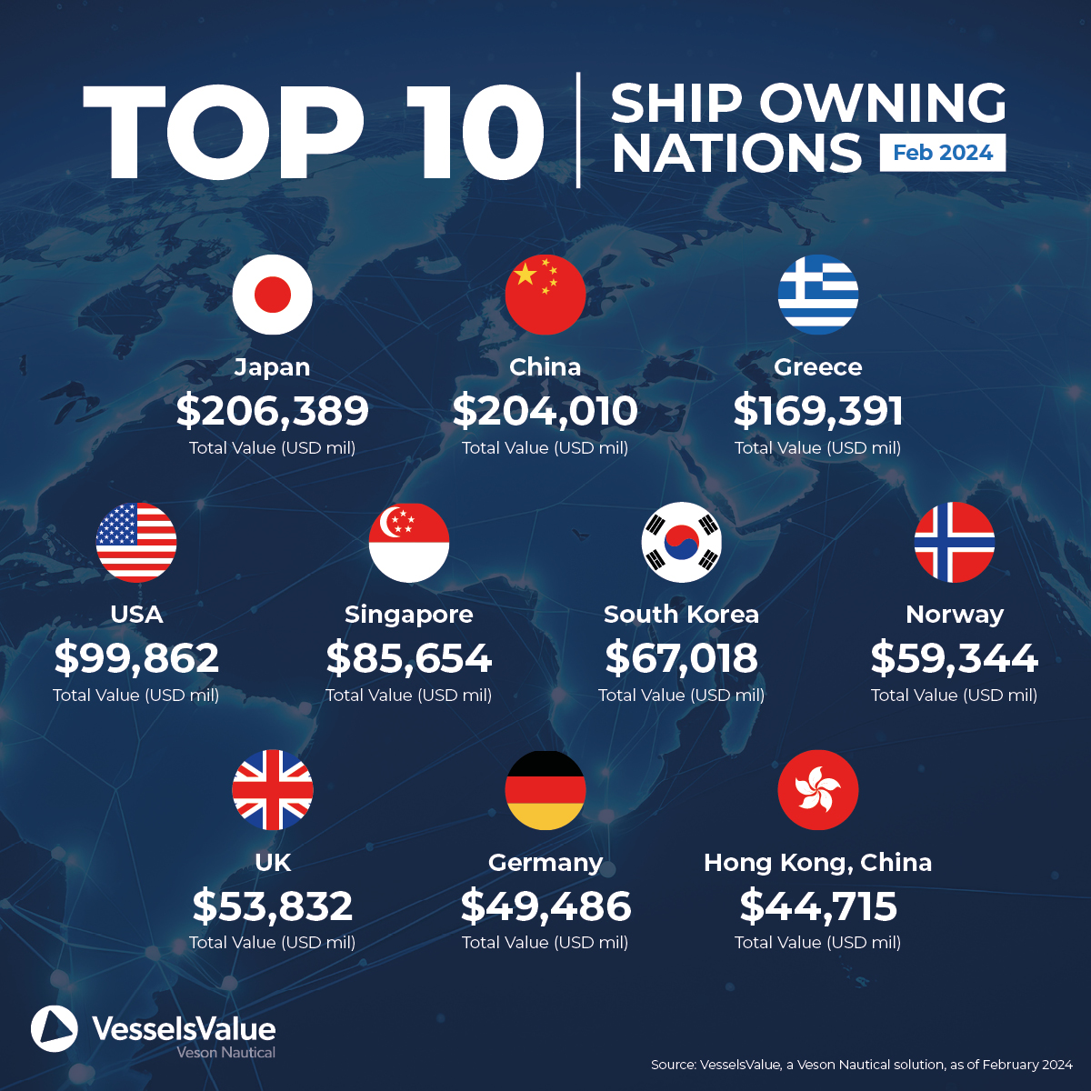 Please note that the data is valid as of February 2024. Total fleet values in the Top 10 shipowning nations & regions include the vessel types covered by VesselsValue: Bulker, Tanker, Container, Small Dry, LNG, LPG, OSV, OCV, MODU, Vehicle Carrier, Roro, Reefer, Renewable, Cruise.