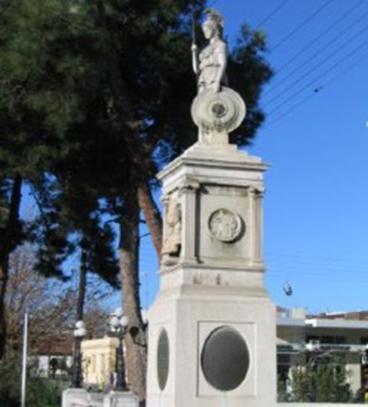 Λευκό μάρμαρο με άριστα δουλεμένες λεπτομέρειες. Κατασκευάστηκε το 1884 από το Ιταλό γλύπτη G. Previsan και τοποθετήθηκε εκεί με την ευκαιρία των εγκαινίων του Θεσσαλικού Σιδηρόδρομου.