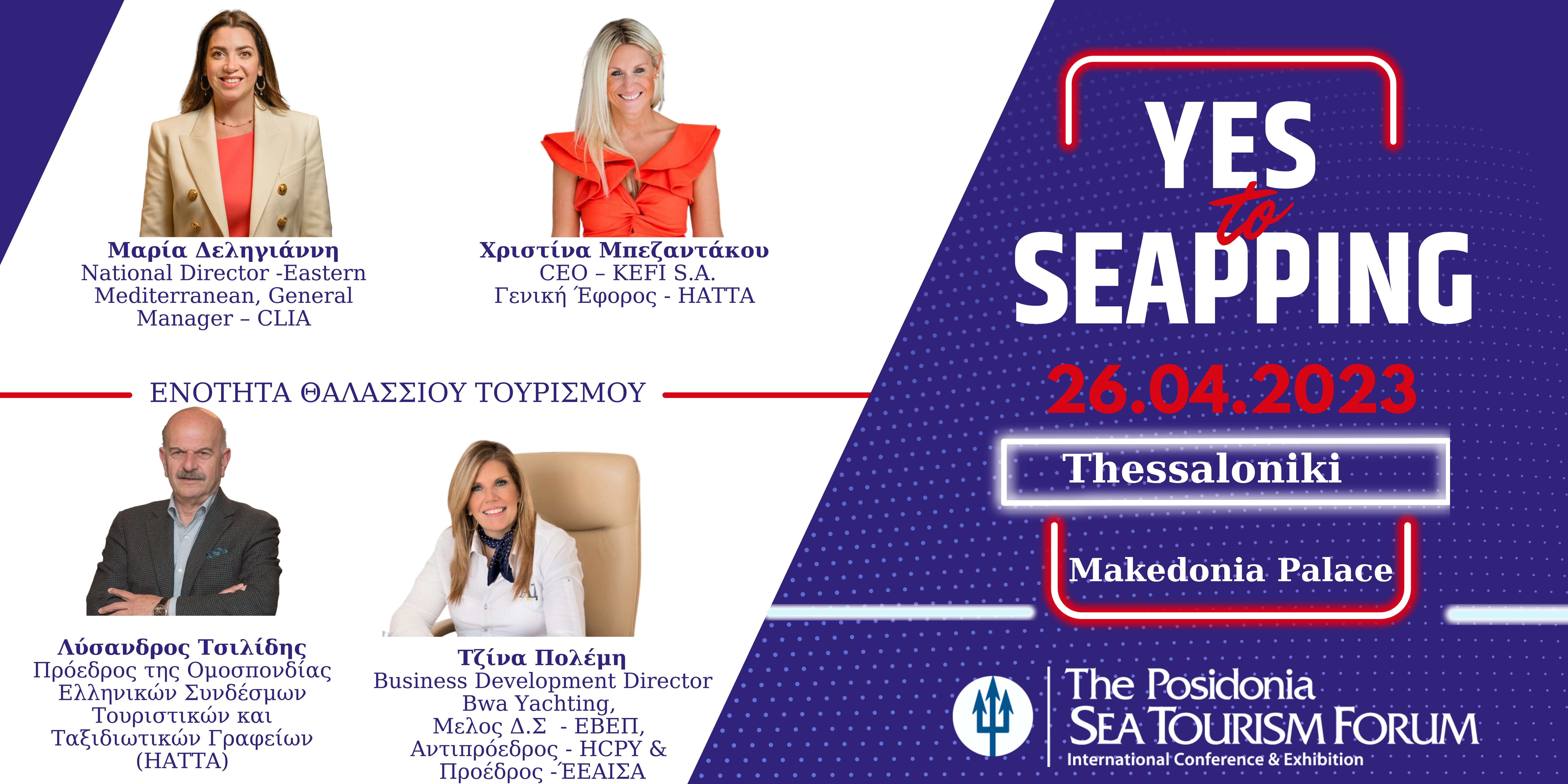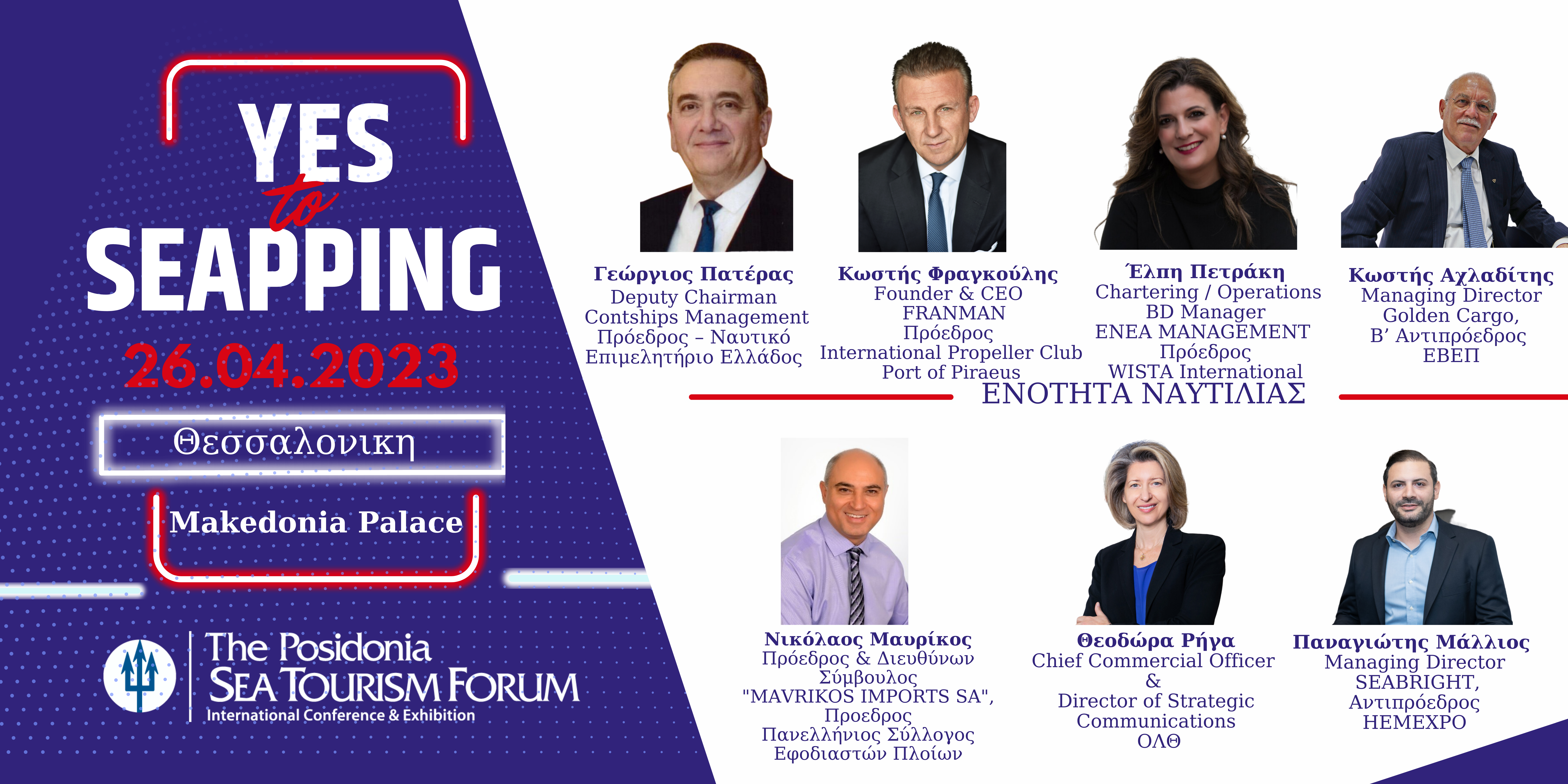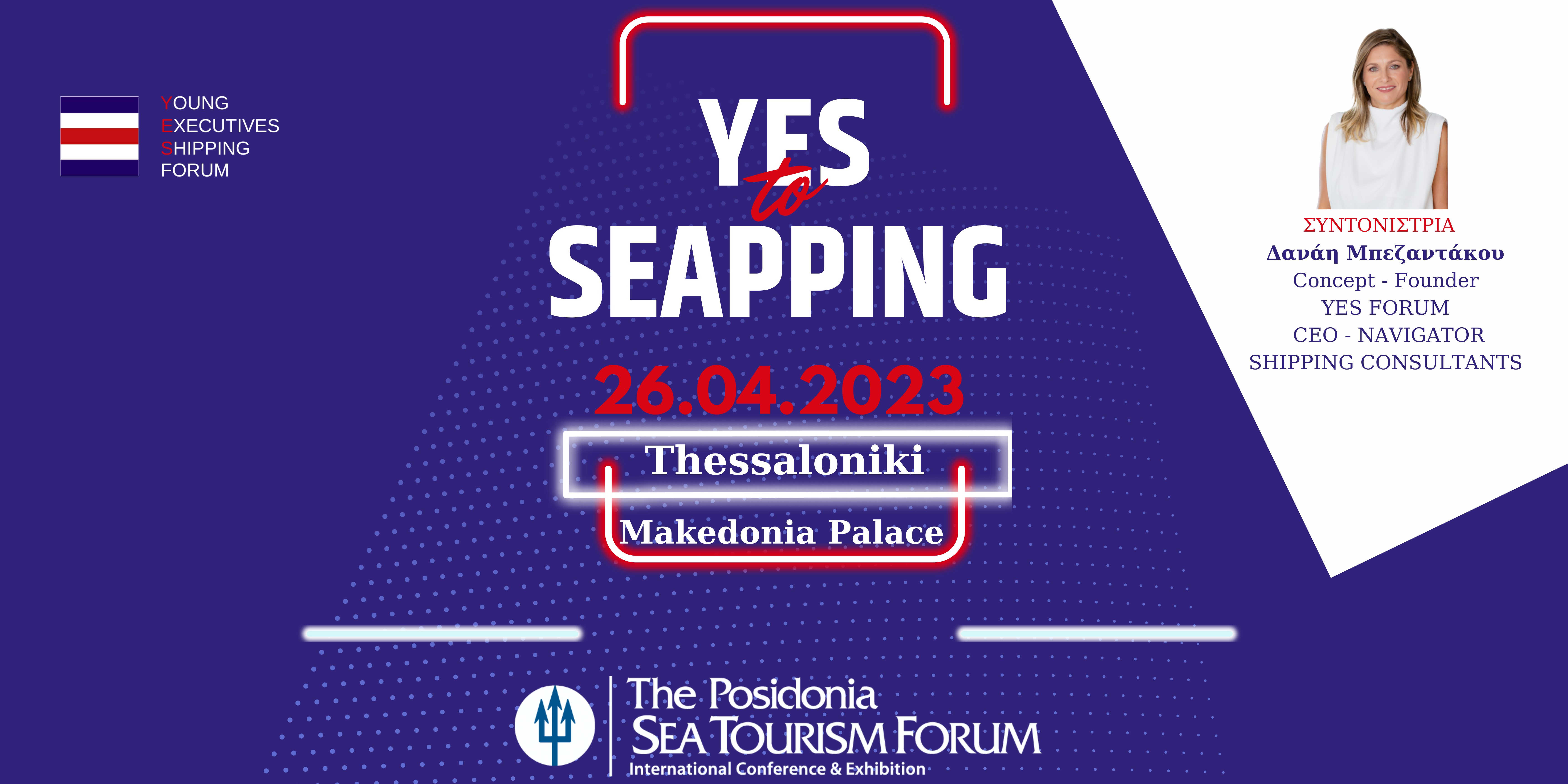 Το YES Forum διοργανώνει το «YES to SEApping Forum 2023», το οποίο θα πραγματοποιηθεί την Τετάρτη 26 Απριλίου 2023 στο πλαίσιο του Posidonia SEA Tourism 2023 στη Θεσσαλονίκη, στο MAKEDONIA PALACE. Το «YES to SEApping Forum 2023» στοχεύει στην ενημέρωση των νέων για την εξελισσόμενη Γαλάζια Οικονομία καλύπτοντας τόσο το φάσμα της Ναυτιλίας όσο και του θαλάσσιου Τουρισμού, δύο κλάδους με καθοριστική σημασία για την οικονομία και ανάπτυξη της Χώρας μας.